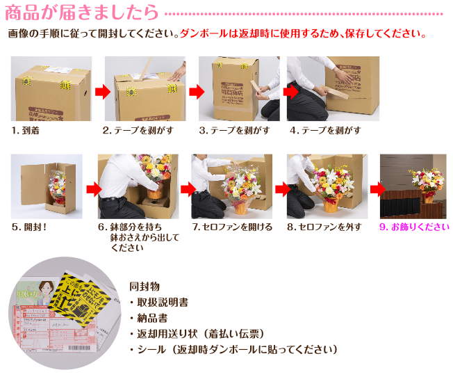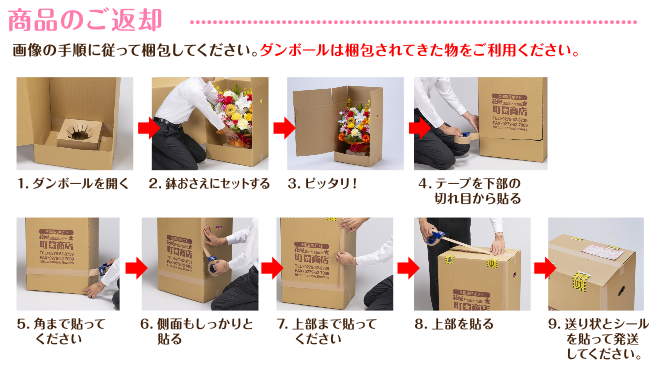●返却の際はお届けした段ボールに入れて鉢おさえに造花を固定して、ガムテープ等で閉じて梱包してください。